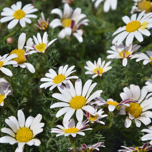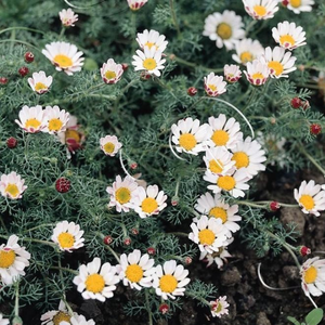 La camomille Marocaine 'Compactum' est une plante vivace de la famille des Asteraceae, originaire du bassin méditerranéen. Elle se caractérise par son port compact et son feuillage finement découpé.