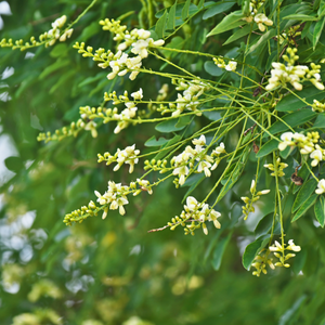 Le Sophora japonica est autofertile et produit ses fleurs blanc-crème en grappes au milieu de l’été, sans besoin de pollinisateurs supplémentaires.