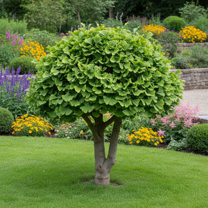 Ginkgo biloba 'Troll' est une variété naine de l'arbre Ginkgo biloba. Cette variété spécifique est appréciée pour sa taille compacte et sa forme en boule, ce qui en fait un choix idéal pour les petits espaces de jardin ou les conteneurs.