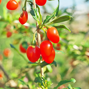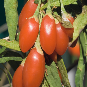 Les baies de goji 'Princess Tao' sont rouges, allongées et très nutritives, reconnues pour leurs bienfaits énergétiques et antioxydants. Elles se consomment fraîches, séchées ou en jus.