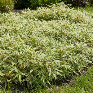 Le Pleioblastus fortunei, aussi connu sous le nom de bambou zébré, est une variété de bambou nain traçant originaire du Japon. Son feuillage panaché vert et crème en fait une plante ornementale très...