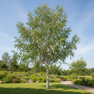 En résumé, le Betula pendula est un arbre ornemental apprécié pour son écorce blanche, lisse et décorative, ainsi que pour sa silhouette élégante et légère. Il préfère les sols humides et bien drainés, ainsi qu'un emplacement ensoleillé ou partiellement ombragé. Il est résistant aux températures froides et aux vents forts, ce qui en fait un choix populaire pour les jardins et les parcs dans les climats nordiques.