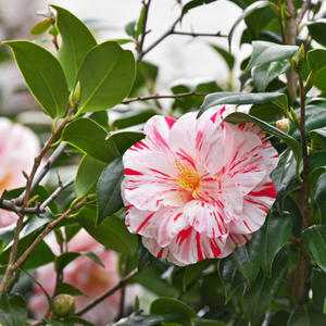 Le Camélia du Japon 'Bonomiana' est une variété d'arbuste à feuilles persistantes appartenant à la famille des Theacées. Cette variété est originaire du Japon et est appréciée pour sa floraison abondante et colorée en hiver et au printemps.