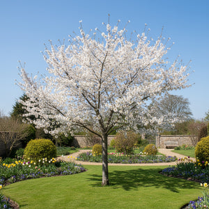 Cet arbre est apprécié pour sa forme élégante et compacte, idéale pour les jardins et les allées. Il offre une floraison abondante en grappes blanches qui attire pollinisateurs et oiseaux, ajoutant un intérêt décoratif au printemps.