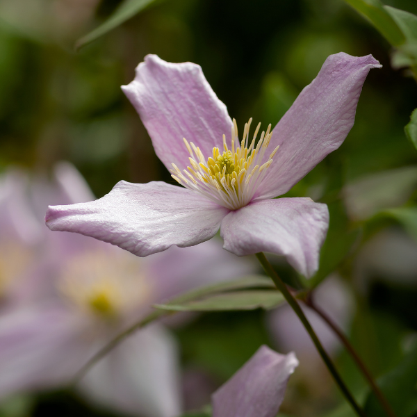 La clématite des montagnes 'Rubens', également connue sous le nom de Clematis montana 'Rubens', est une plante grimpante vigoureuse et rustique, originaire des régions montagneuses de l'Himalaya. Elle produit des fleurs rose clair, parfumées et étoilées en abondance au printemps, qui couvrent complètement la plante et mesurent jusqu'à 5 cm de diamètre. Les feuilles vertes brillantes de cette clématite sont ovales et pointues.