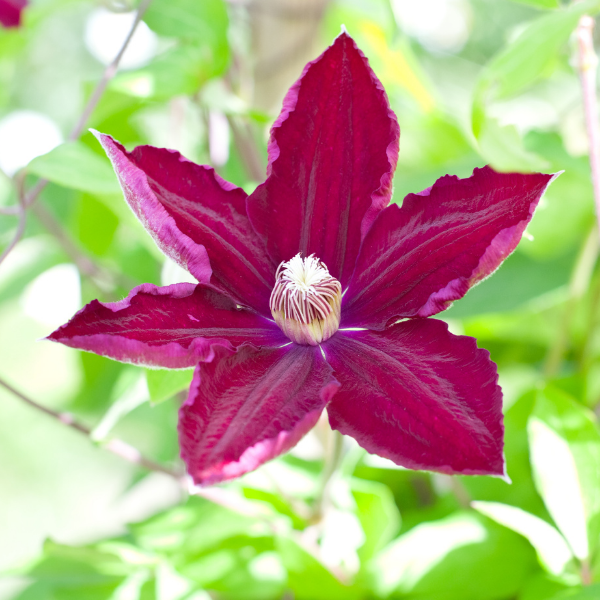 La clématite 'Rouge Cardinal' est une variété de clématite hybride qui produit des fleurs rouge foncé velouté, mesurant environ 12 cm de diamètre, avec des étamines jaunes proéminentes. Cette plante grimpante à...