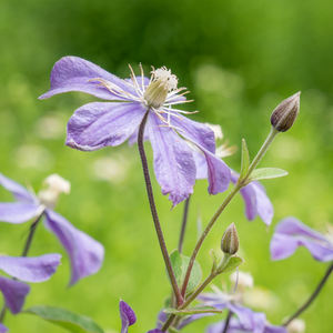 La Clematis ‘Arabella’ est une variété herbacée non grimpante, idéale pour les massifs, les bordures ou les jardinières. Elle préfère une exposition ensoleillée à mi-ombre, avec un sol fertile, humifère, frais mais bien drainé, légèrement acide à neutre. Creusez un trou de 30 à 40 cm en profondeur et en largeur. Plantez-la en enterrant le collet de 5 cm sous le sol pour stimuler la reprise et protéger la base. Dans un pot, utilisez un mélange terreau/compost et prévoyez un tuteur si vous souhaitez la palisser.
