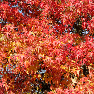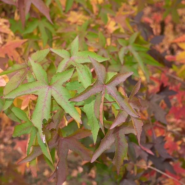 Les feuilles du Liquidambar styraciflua sont lobées et palmées, d'un vert foncé brillant en été. À l'automne, elles prennent une coloration spectaculaire allant du jaune, de l'orange au rouge vif, ajoutant une beauté automnale éclatante au paysage.