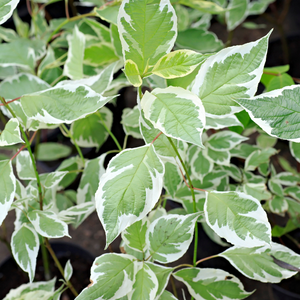 Variété : Le cornus alba Gouchaultii est un arbuste dense, aux branches érigées et au feuillage caduc panaché. Ce feuillage est vert bordé de blanc de mars à septembre, puis prend une couleur orangée à l'automne avant de tomber. En mai-juin cet arbuste se couvrira de fleurs plates blanches. Cet arbuste reste très agréable en hiver grâce à son bois rouge vif.