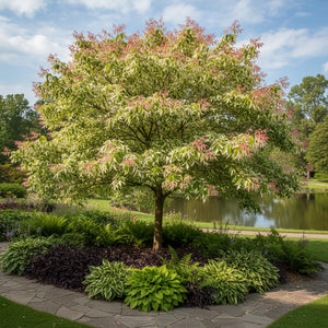 L'érable à feuilles de frêne 'Flamingo' produit des grappes de fleurs vertes au printemps qui peuvent être suivies de petites samares ailées en été. Les feuilles panachées fournissent une belle couleur toute la saison, avec une belle teinte automnale jaune doré.