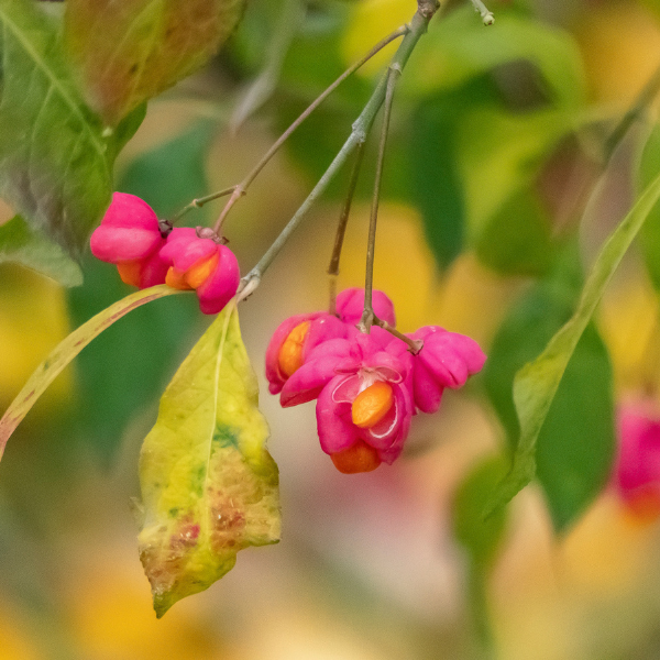 Le Fusain ailé nain doit son nom aux ailes distinctives qui se forment le long de ses tiges une fois qu'il a atteint l'âge de maturité. Au printemps, il produit de petites fleurs jaune-vert discrètes, suivies de capsules roses vives qui s'ouvrent pour révéler des graines orange vif.