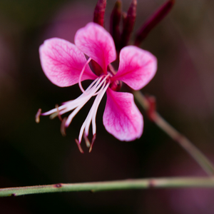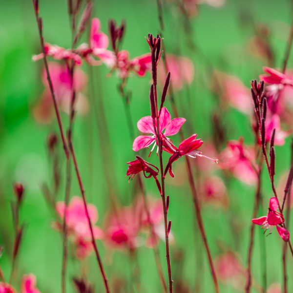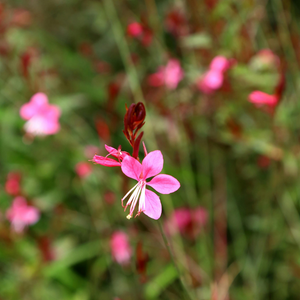 Le Gaura lindheimeri ‘Butterfly Rose’ est une plante vivace très facile, demandant peu d’entretien. Arrosez légèrement la première année pour favoriser l’enracinement, puis uniquement en cas de sécheresse prolongée, car il supporte très bien le manque d’eau. Supprimez les hampes défleuries au fur et à mesure afin de prolonger la floraison jusqu’aux gelées. En fin d’hiver, rabattez les tiges à 20 cm du sol pour stimuler la repousse et maintenir une touffe compacte. Aucun apport d’engrais n’est nécessaire : un sol trop riche favorise le feuillage au détriment des fleurs.