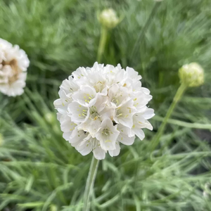 Le gazon d'Espagne 'alba' forme des touffes compactes de feuilles persistantes étroites, qui sont d'un vert foncé brillant. En été, des tiges dressées émergent de la rosette de feuilles, portant des inflorescences globulaires blanches et douces, qui atteignent une hauteur de 15 à 30 cm. Les fleurs attirent les papillons et les abeilles et restent en fleurs pendant plusieurs semaines.