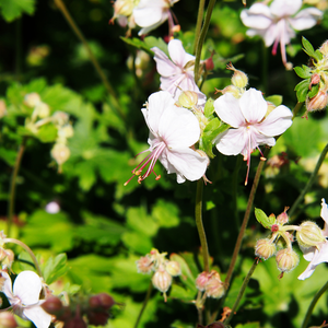 Le Geranium vivace ‘Biokovo’ est une plante très rustique et facile à entretenir. Arrosez régulièrement la première année pour aider à l’enracinement, puis seulement en cas de sécheresse prolongée, car il tolère bien la sécheresse une fois installé. Supprimez les fleurs fanées pour prolonger la floraison et maintenir un port compact. Après la floraison principale, rabattez légèrement la touffe pour stimuler une nouvelle végétation. En fin d’hiver, nettoyez simplement les parties sèches avant la reprise printanière. Aucun apport d’engrais particulier n’est nécessaire, mais un peu de compost au printemps soutiendra sa vigueur.