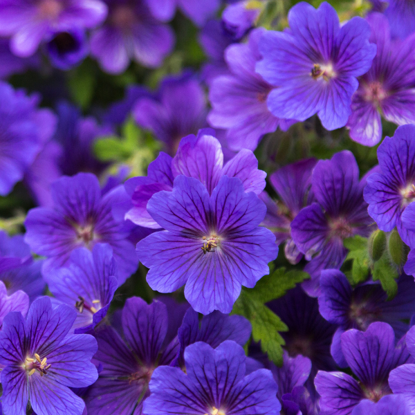 Le Géranium 'Rozanne' présente un port bas et étalé, avec un feuillage vert moyen découpé et délicat. Au printemps et en été, il produit une abondance de fleurs d'un bleu vif, avec des veines plus foncées qui ajoutent de la profondeur et de l'intérêt visuel. Les fleurs sont relativement grandes et se renouvellent tout au long de la saison, attirant les abeilles et les papillons dans le jardin.