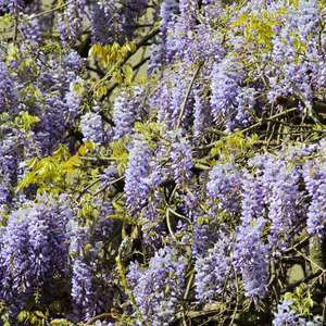 La glycine de Chine, également connue sous le nom de Wisteria sinensis, est une plante grimpante originaire d'Asie de l'Est. Elle est très appréciée pour sa floraison abondante et spectaculaire de grappes de fleurs en forme de papillon qui peuvent mesurer jusqu'à 30 cm de longueur. Les fleurs sont de couleur mauves.