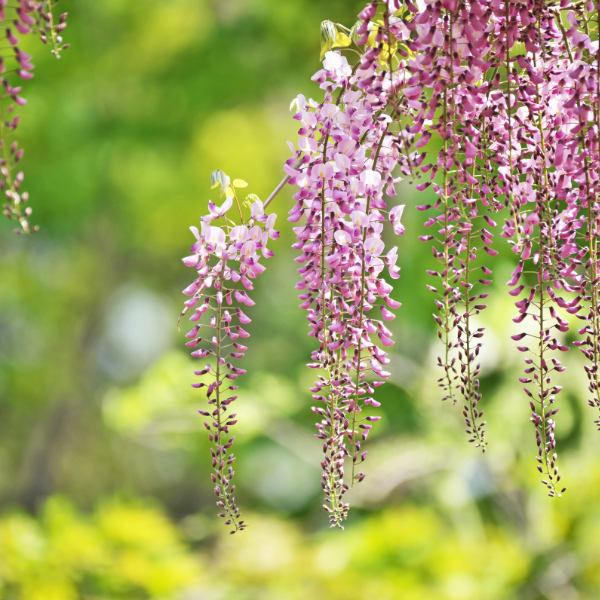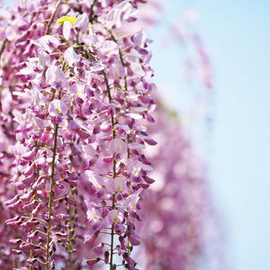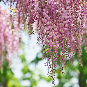 La glycine japonaise 'Pink Ice', également connue sous le nom de Wisteria floribunda 'Pink Ice', est une plante grimpante à floraison abondante originaire du Japon. Elle est caractérisée par ses nombreuses grappes de fleurs rose lavande de 40 à 60 cm qui apparaissent en fin de printemps et début d'été. Les fleurs mesurent environ 2 cm de longueur et ont un parfum doux et agréable. Son feuillage se teinte de bronze dès le début de la croissance, ce qui permet également de l'identifier.
