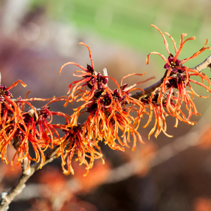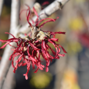 L’Hamamelis × intermedia ‘Ruby Glow’ est un arbuste rustique et facile à cultiver en sol acide. Arrosez régulièrement durant les deux premières années pour maintenir un sol frais, surtout en été. Ensuite, il supporte une certaine sécheresse, mais reste plus florifère en sol légèrement humide. Appliquez un paillage organique au pied pour protéger ses racines superficielles et conserver l’humidité. La taille n’est pas indispensable : contentez-vous de supprimer le bois mort ou les rameaux déséquilibrés après la floraison. Un apport de compost ou d’engrais pour plantes de terre de bruyère au printemps renforcera sa vigueur. Sa floraison hivernale, en janvier-février, offre de petites fleurs rubis à pétales rubanés, très décoratives et légèrement parfumées, qui illuminent le jardin en plein cœur de l’hiver.