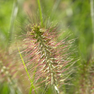L'herbe aux écouvillons 'Japonicum', également connue sous le nom de Pennisetum alopecuroides 'Japonicum', est une plante herbacée vivace ornementale originaire d'Asie. Cette plante pousse en touffes denses de feuillage fin et élégant, mesurant environ 75cm de hauteur pour 75 cm de largeur. Les feuilles sont étroites et pointues et de couleur vert foncé, devenant dorées à l'automne et les tiges sont rigides et dressées. En été, l'herbe aux écouvillons 'Japonicum' produit de longues tiges minces portant des épis cylindriques de fleurs blanches et duveteuses, devenant à maturité brunes qui ressemblent à des écouvillons.