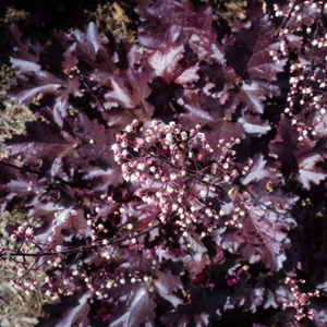 L'Heuchère 'Black Beauty' est une plante vivace ornementale appartenant à la famille des Saxifragacées. Cette variété cultivée se distingue par son feuillage foncé, presque noir, qui crée un fort contraste avec les autres plantes du jardin. Les feuilles mesurent environ 10 cm de longueur et sont en forme de cœur avec une texture légèrement ridée.
