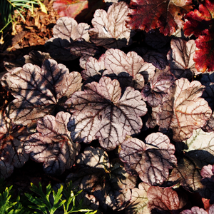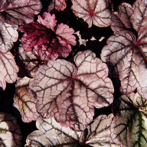 L'Heuchère 'Plum Pudding' est une plante vivace ornementale appartenant à la famille des Saxifragacées. Cette variété cultivée se distingue par son feuillage contrasté et nervuré, pourpre-brun à presque rose, Les feuilles sont lobées, nervurées, en forme de cœur et mesurent environ 10 cm de longueur.