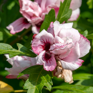 En termes de port, l'Hibiscus 'Lady Stanley' est un arbuste dressé et buissonnant qui peut atteindre une hauteur d'environ 1 à 1,5 mètre. Son port compact et dense en fait un choix polyvalent pour les massifs, les bordures ou les haies basses. Il peut également être cultivé en pot pour agrémenter une terrasse ou un balcon.