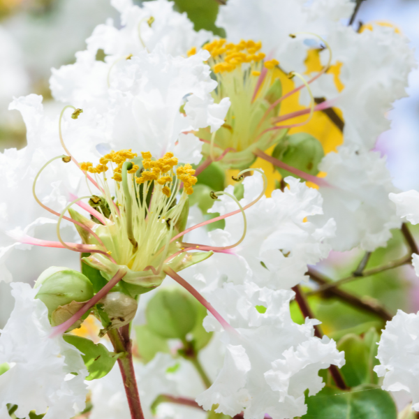 Fleurs : L'attrait principal du Lilas des Indes 'Neige d'Été' réside dans sa floraison spectaculaire et abondante. Au cours de l'été, il produit de grandes inflorescences en forme de grappes de fleurs blanches, créant un effet de neige. Les fleurs sont très parfumées et attirent les abeilles et les papillons.