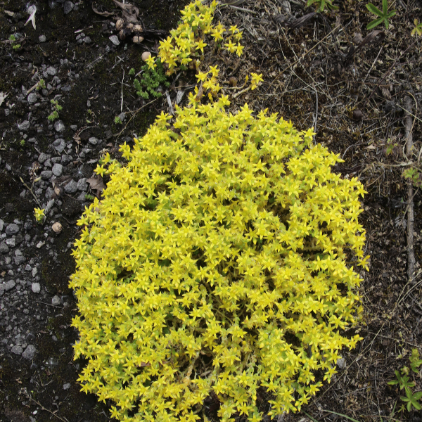 Le Sedum acre forme de petites touffes rampantes de feuilles vertes en forme de lance. Au printemps et en été, de nombreuses fleurs jaunes apparaissent, créant un spectacle lumineux et attrayant. Les fleurs sont souvent visitées par les abeilles et les papillons.