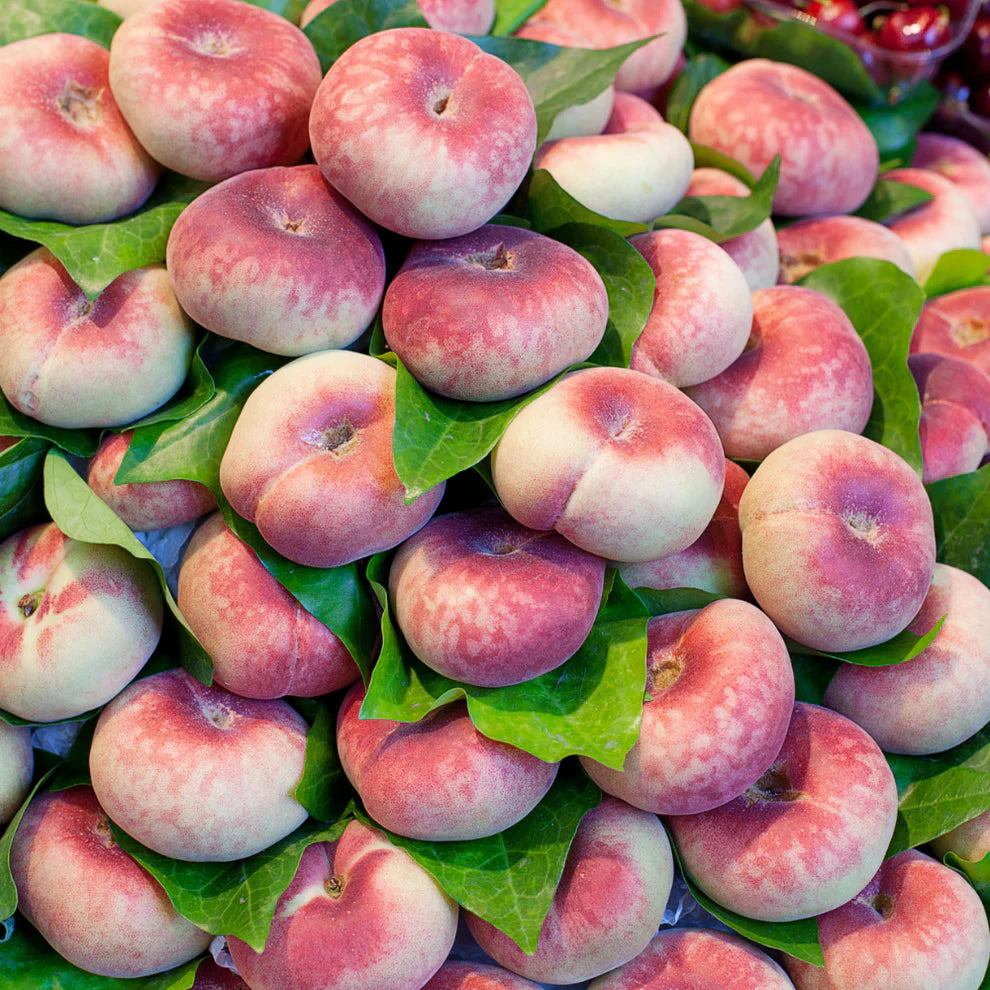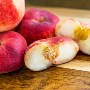 Les fruits du Pêcher Platicarpa Blanc sont reconnaissables à leur forme aplatie, avec une peau fine et duveteuse, de couleur jaune pâle avec des teintes rosées à maturité. Leur chair est blanche, tendre, juteuse et très sucrée, avec une saveur délicate et parfumée. Ces pêches plates sont parfaites pour être consommées fraîches, mais elles sont également excellentes pour la préparation de desserts légers, de confitures, ou pour accompagner des salades de fruits.