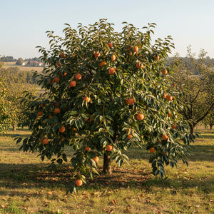 Le plaqueminier 'Pomme O-Gosho' atteint généralement une hauteur de 4 à 6 mètres à maturité, avec un port compact, pyramidal et bien structuré. Il convient parfaitement aux jardins de taille moyenne. Une taille légère peut être réalisée en fin d’hiver pour maintenir une belle forme, mais elle n’est pas indispensable à la fructification.