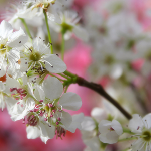 Au printemps, 'Chanticleer' se couvre d'une abondante floraison blanche. Les fleurs sont petites, à cinq pétales, et elles apparaissent en grappes denses et arrondies. Elles offrent un spectacle spectaculaire, ajoutant une touche de beauté et de délicatesse à l'arbre.