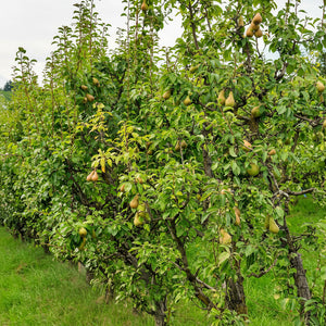 Les poires Conférence mesurent généralement entre 8 et 12 cm de longueur. La production commence 3 à 4 ans après la plantation, avec une récolte qui a lieu à partir de septembre jusqu'en octobre. Cette variété est connue pour sa productivité régulière et abondante, offrant une récolte généreuse chaque année. Le Poirier Conférence est partiellement autofertile, mais la présence d'autres poiriers comme le Poirier William's ou le Poirier Beurré Hardy améliore considérablement la pollinisation et donc la production.