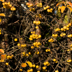 Malus 'Golden Hornet' est un petit arbre fruitier ornemental très apprécié pour son feuillage, ses fleurs et ses fruits. Cet arbre est souvent cultivé pour ses fleurs printanières, qui sont d'un blanc pur avec une teinte rosée délicate. Les fleurs sont produites en abondance et créent un spectacle magnifique lorsque l'arbre est en pleine floraison. En automne, les fruits de Malus 'Golden Hornet' apparaissent. Ils sont petits et de couleur jaune doré, d'où le nom de l'arbre. Les fruits sont persistants et restent sur l'arbre jusqu'à la fin de l'automne, ajoutant ainsi une touche décorative supplémentaire.