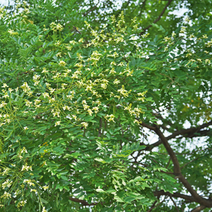 En été, l'arbre produit des grappes de fleurs parfumées de couleur blanc crème à jaune pâle. Les fleurs sont papilionacées, ce qui signifie qu'elles ont une forme semblable à un papillon. Elles attirent les insectes pollinisateurs et ajoutent une touche de beauté à l'arbre.
