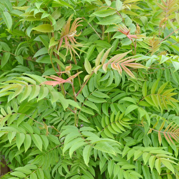 Le Sorbaria sorbifolia ‘Pink Hopi’ est un arbuste rustique, vigoureux et facile à cultiver. Arrosez régulièrement les deux premières années, surtout en été, pour maintenir un sol frais. Par la suite, il tolère une certaine sécheresse. Un paillage organique au pied permet de conserver l’humidité et de limiter les mauvaises herbes. Taillez en fin d’hiver ou au début du printemps pour supprimer le bois mort et contenir son développement, car il a tendance à drageonner. Un apport annuel de compost ou d’engrais organique au printemps soutiendra sa croissance et sa floraison. Ses panicules légères, d’un rose délicat, apportent une touche de fraîcheur et d’élégance au jardin.