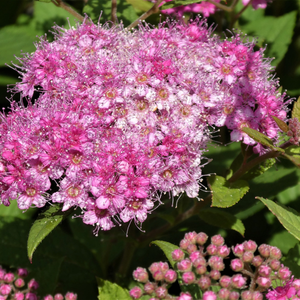 La Spirée japonaise 'Crispa' est un arbuste à feuillage caduc de 1,2 mètre de haut à maturité, avec une belle floraison rose foncé en plein été. Elle est idéale pour les jardins de petite taille ou pour les terrains de taille moyenne, elle est également adaptée pour les pots et les bacs sur un balcon ou une terrasse.