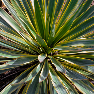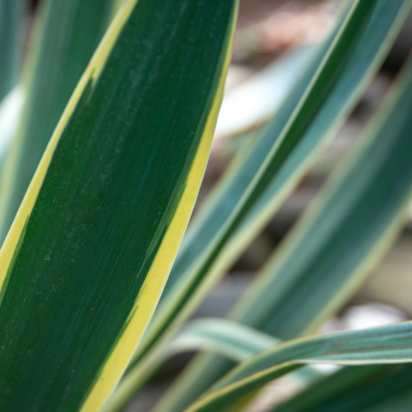 Le Yucca gloriosa ‘Variegata’ est une vivace persistante, rustique et résistante à la sécheresse. Une fois bien installé, il ne demande pratiquement aucun arrosage, sauf en cas de sécheresse prolongée durant ses deux premières années. Supprimez régulièrement les feuilles sèches à la base pour conserver un port net. Après la floraison, coupez la hampe défleurie à ras pour stimuler la vigueur de la plante. Aucun engrais n’est nécessaire. Un paillage minéral (graviers, pouzzolane) met en valeur son port et protège son collet. Ses rosettes rigides aux feuilles panachées de vert et de jaune crème, surmontées en été de hautes hampes de fleurs blanches en clochettes, apportent une touche exotique et élégante au jardin.